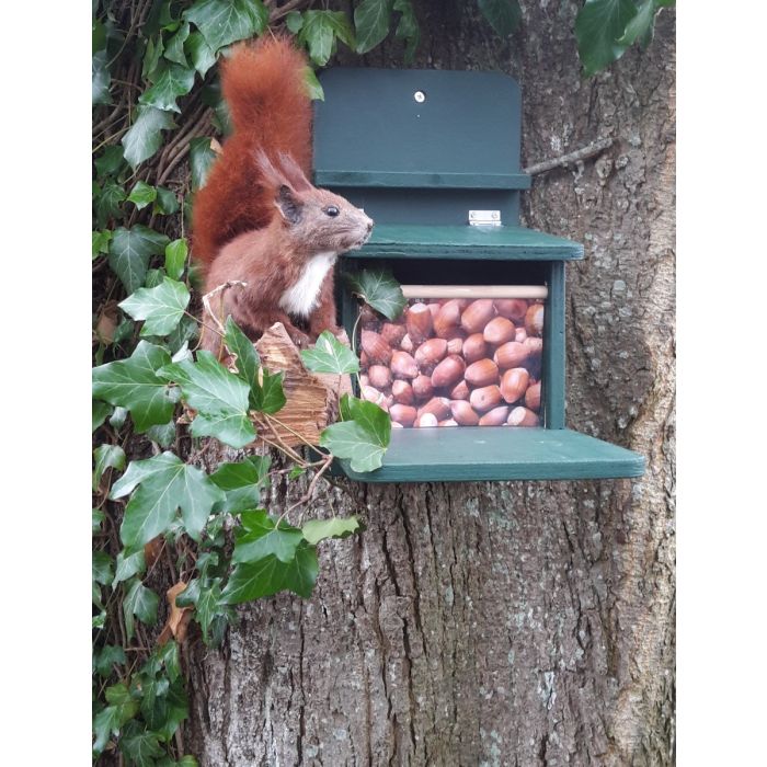 Futterhäuschen für Eichhörnchen zum Anhängen an einen Baumstamm.